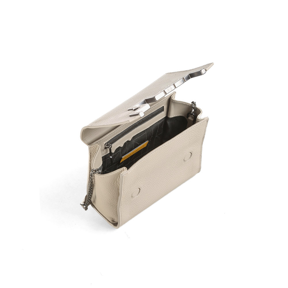 این کیف زنانه با طراحی شیک و مدرن، انتخابی مناسب برای استفاده روزمره یا حضور در مهمانیها است. کیف دارای دو بند متفاوت است: یک دسته کوتاه که تلفیقی از زنجیر و چرم بوده و برای حمل دستی طراحی شده است، و یک بند زنجیری بلند که امکان حمل به صورت دوشی یا مورب را فراهم میکند. یراق سرخانه کیف که با نام "مشق دال" شناخته میشود، با طراحی بسیار مدرن و زیبا، جلوهای خاص و چشمنواز به کیف بخشیده است. این محصول با ترکیب هوشمندانه عملکرد و زیبایی، انتخابی ایدهآل برای همراهی در موقعیتهای مختلف است.